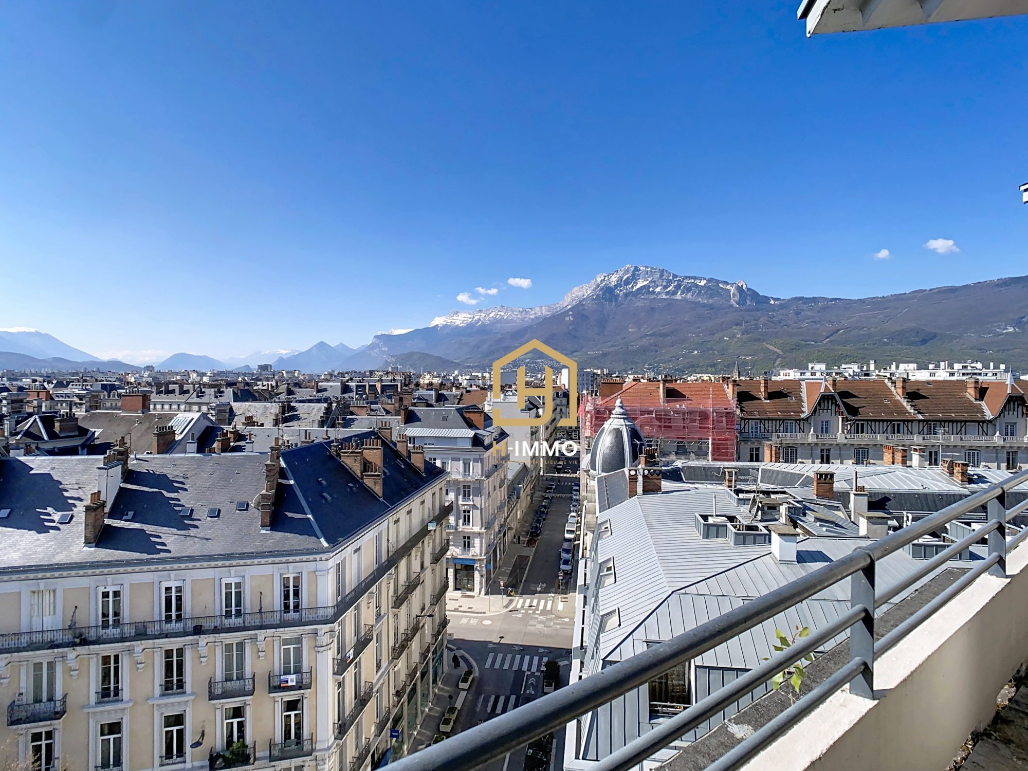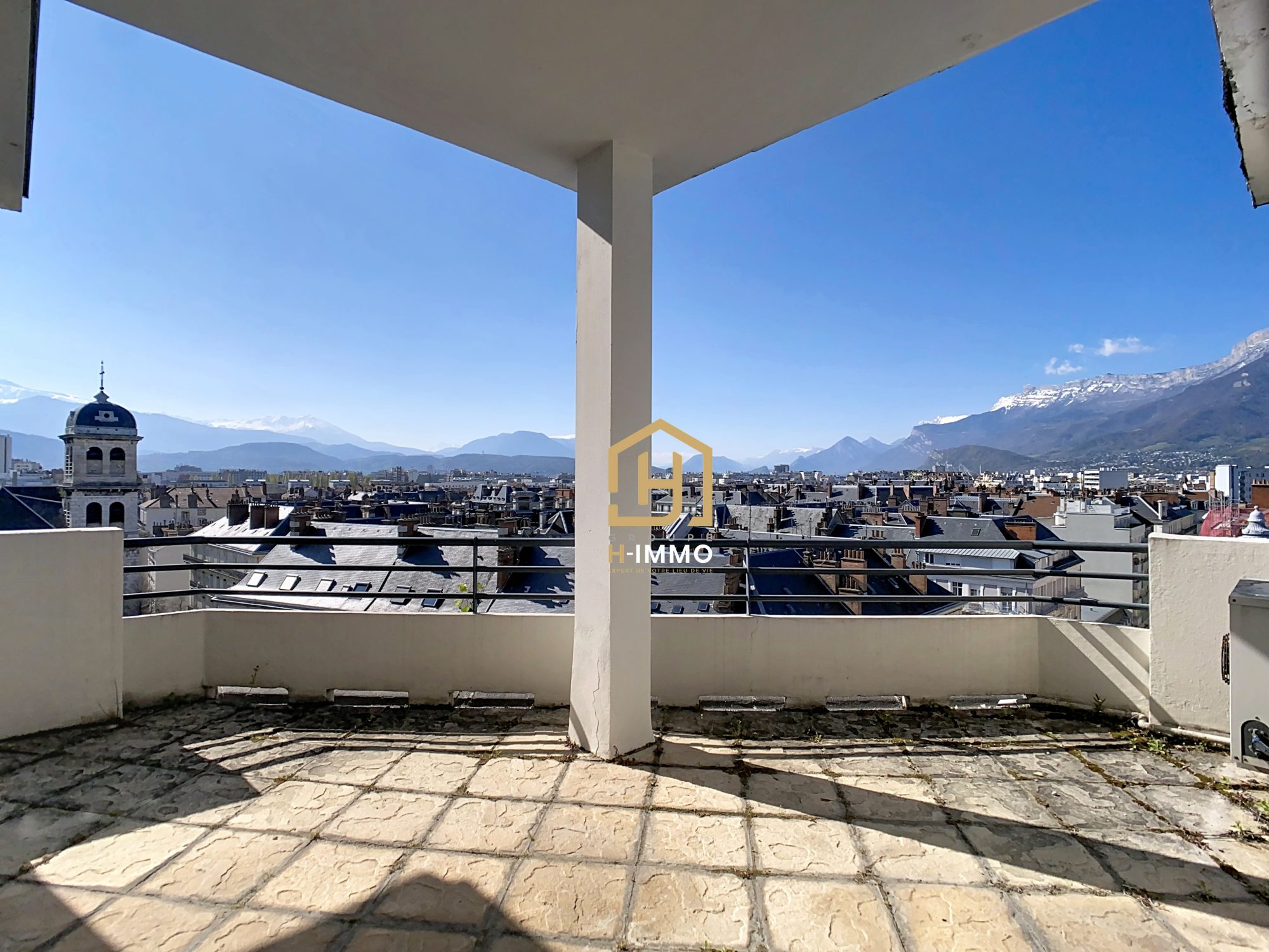 Le Joyau : L’atout maître du bien est sa terrasse de 11 m², en grande partie couverte, véritable salon d’extérieur utilisable par tous les temps. Elle offre un panorama spectaculaire à 180° sur les toits de Grenoble, s’étendant du massif de Belledonne jusqu’aux crêtes du Vercors.