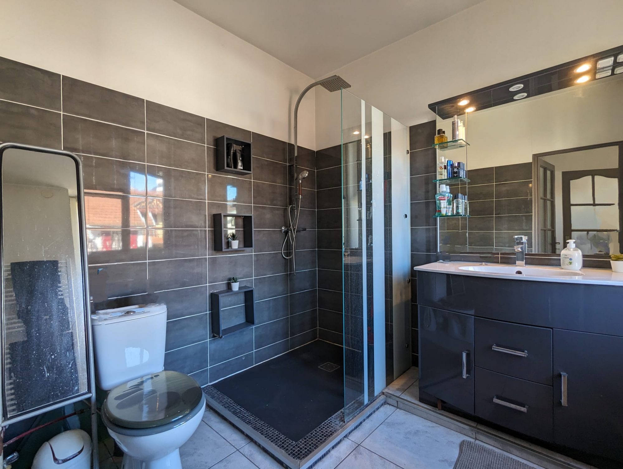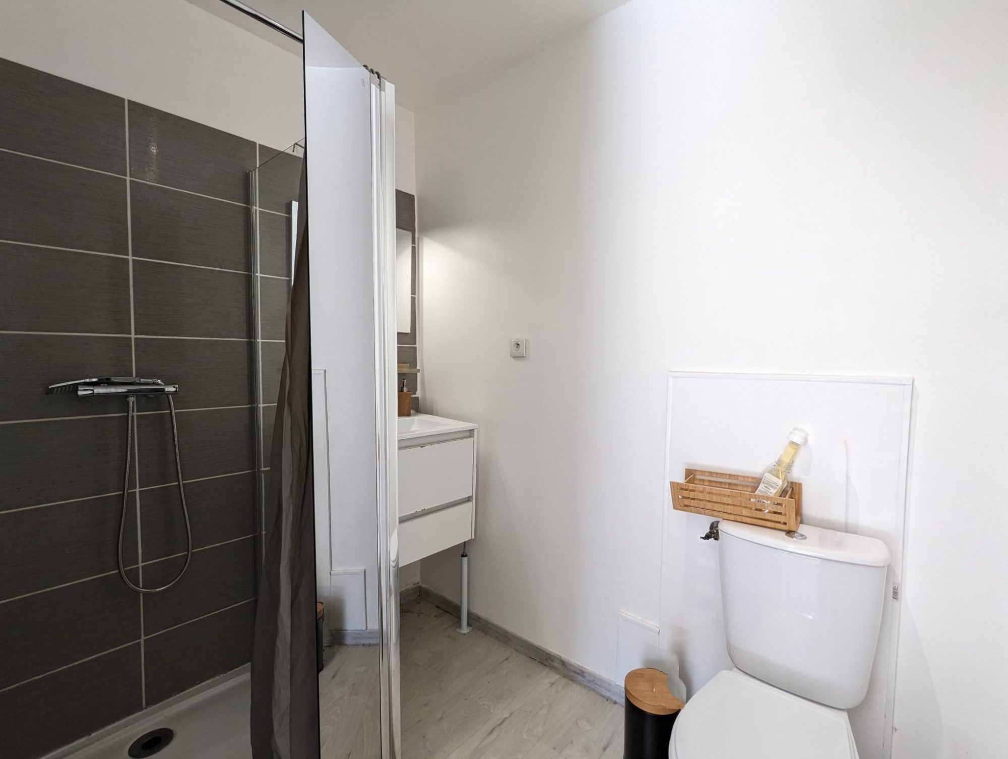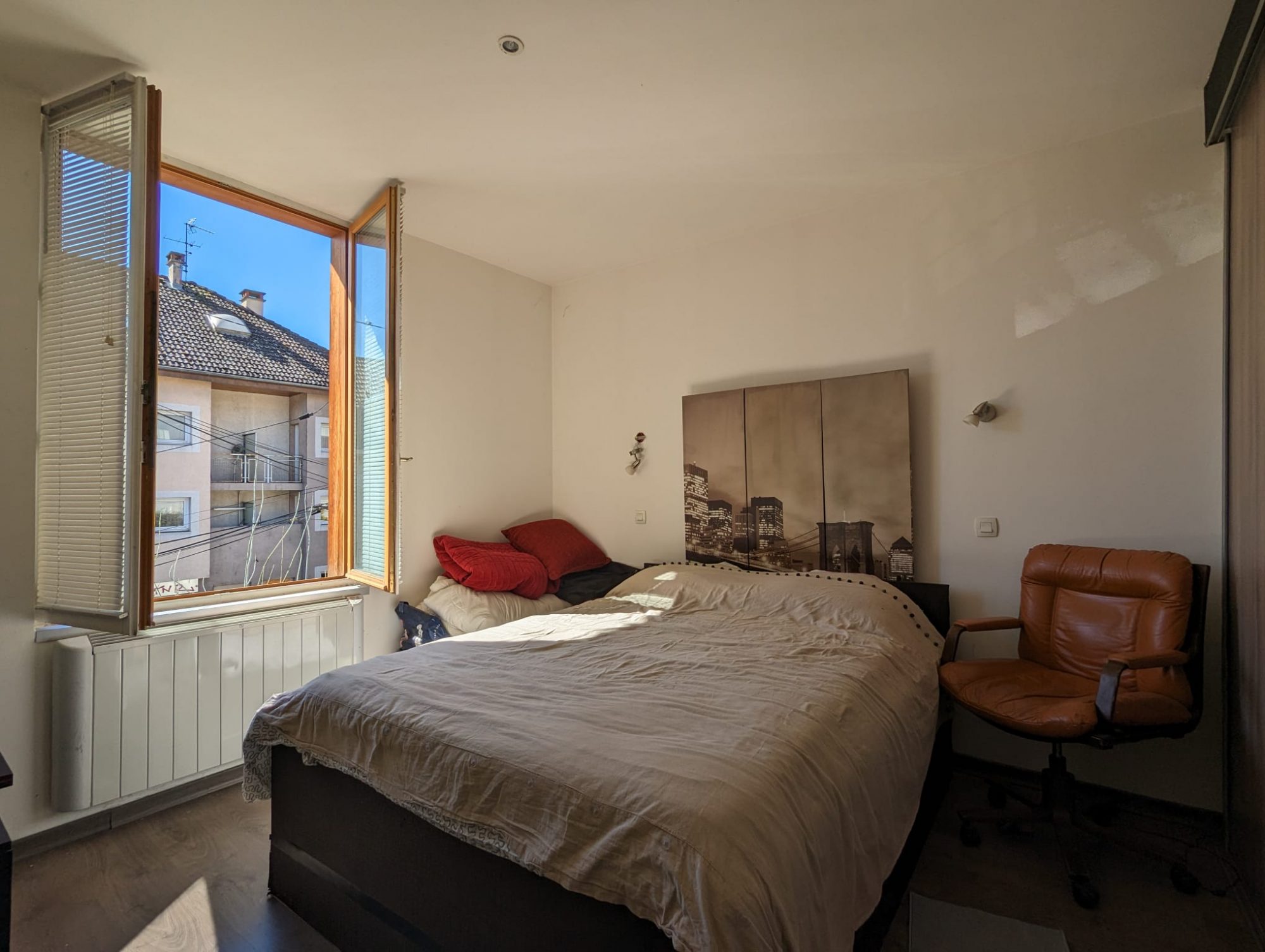 On accède au premier étage par un escalier privatif. A l’étage, on retrouve un spacieux T2 de 53m² avec une grande pièce de vie de 32.5m² composé d’un séjour et d’une cuisine aménagée et équipée. D’une chambre de 13.5m² avec placard coulissant et d’une salle d’eau avec douche à l’italienne. L’appartement de l’étage est traversant NORD/SUD. Une partie du terrain est utilisé comme place de stationnement pour garer un véhicule.