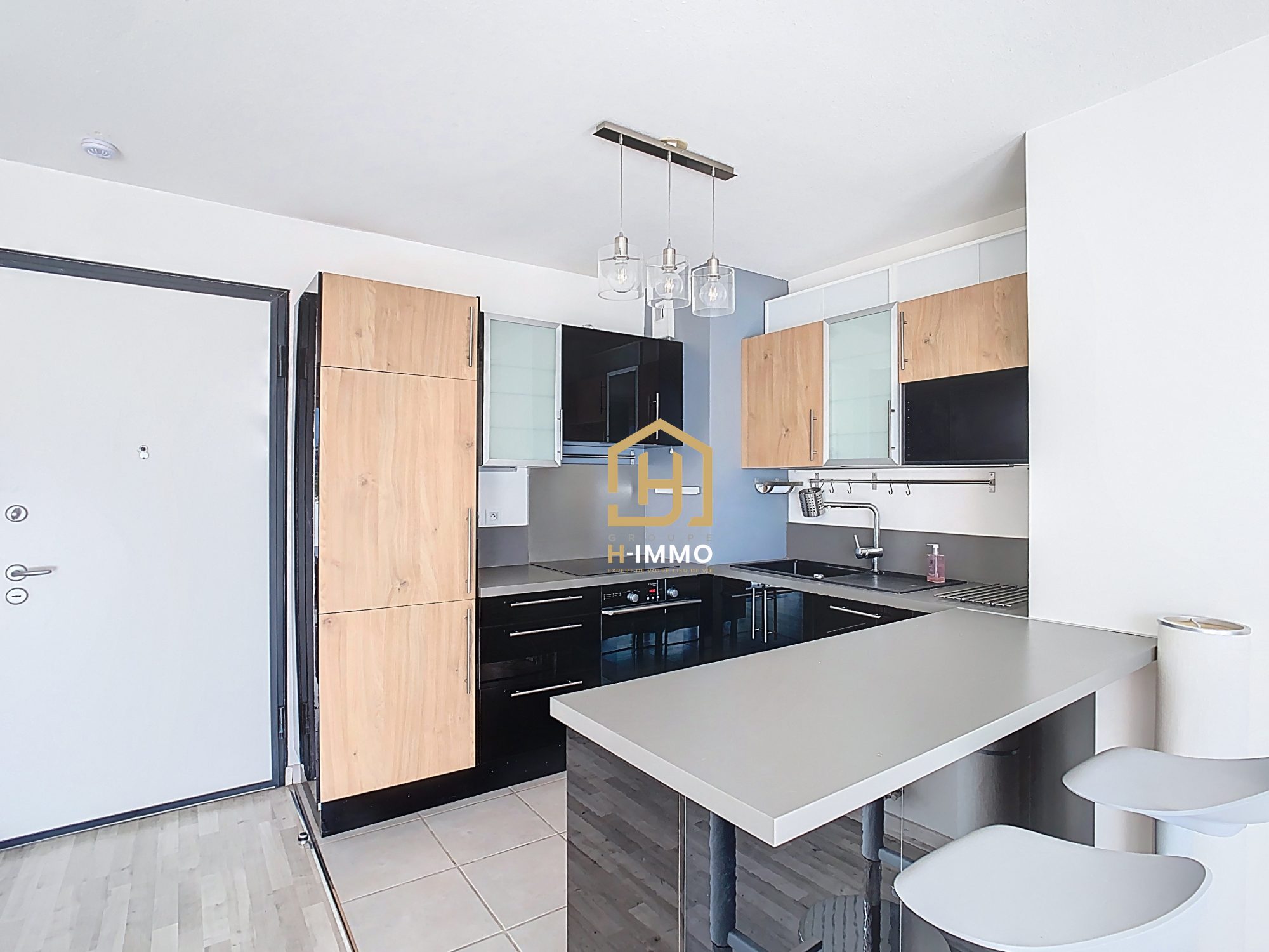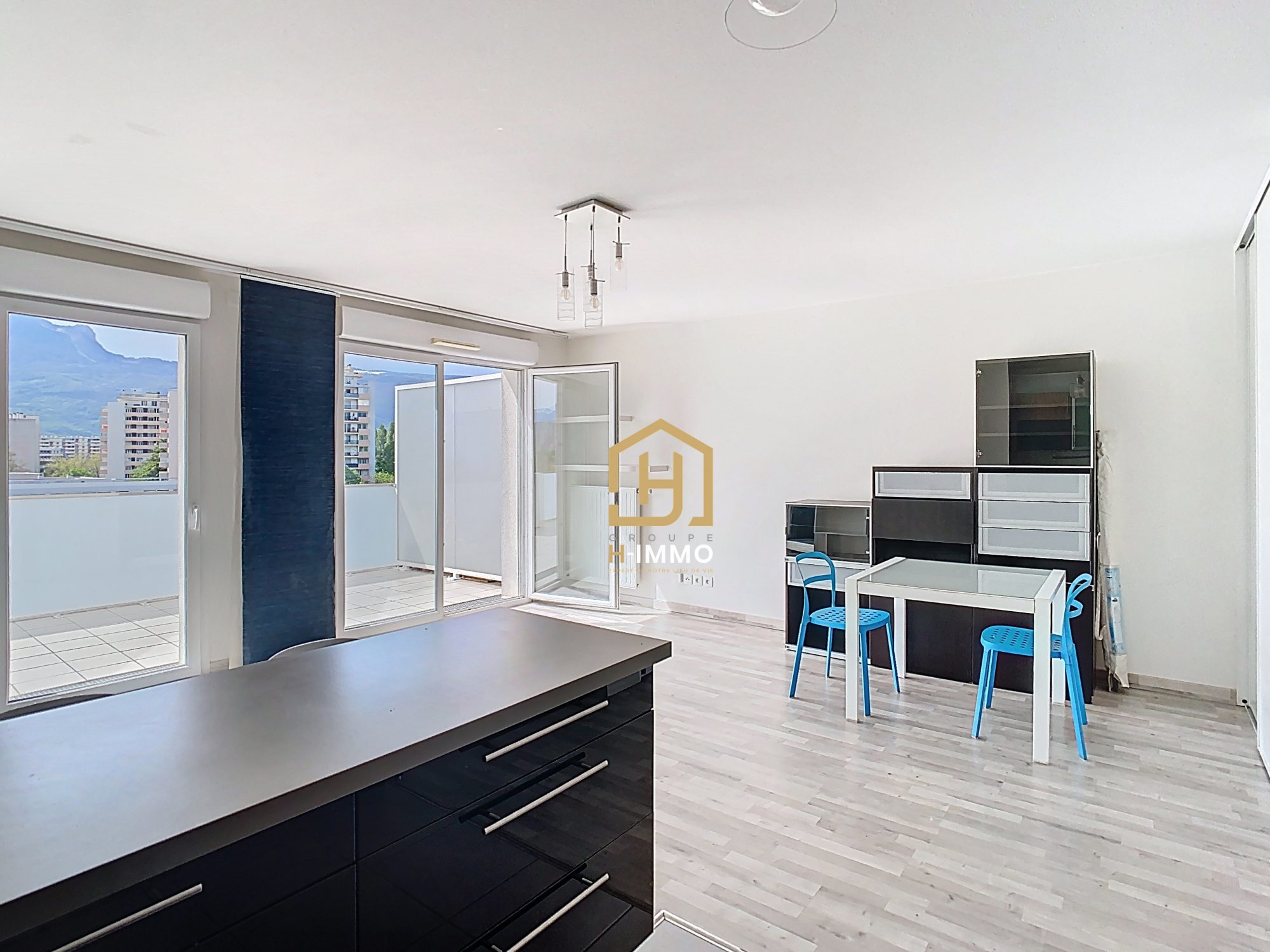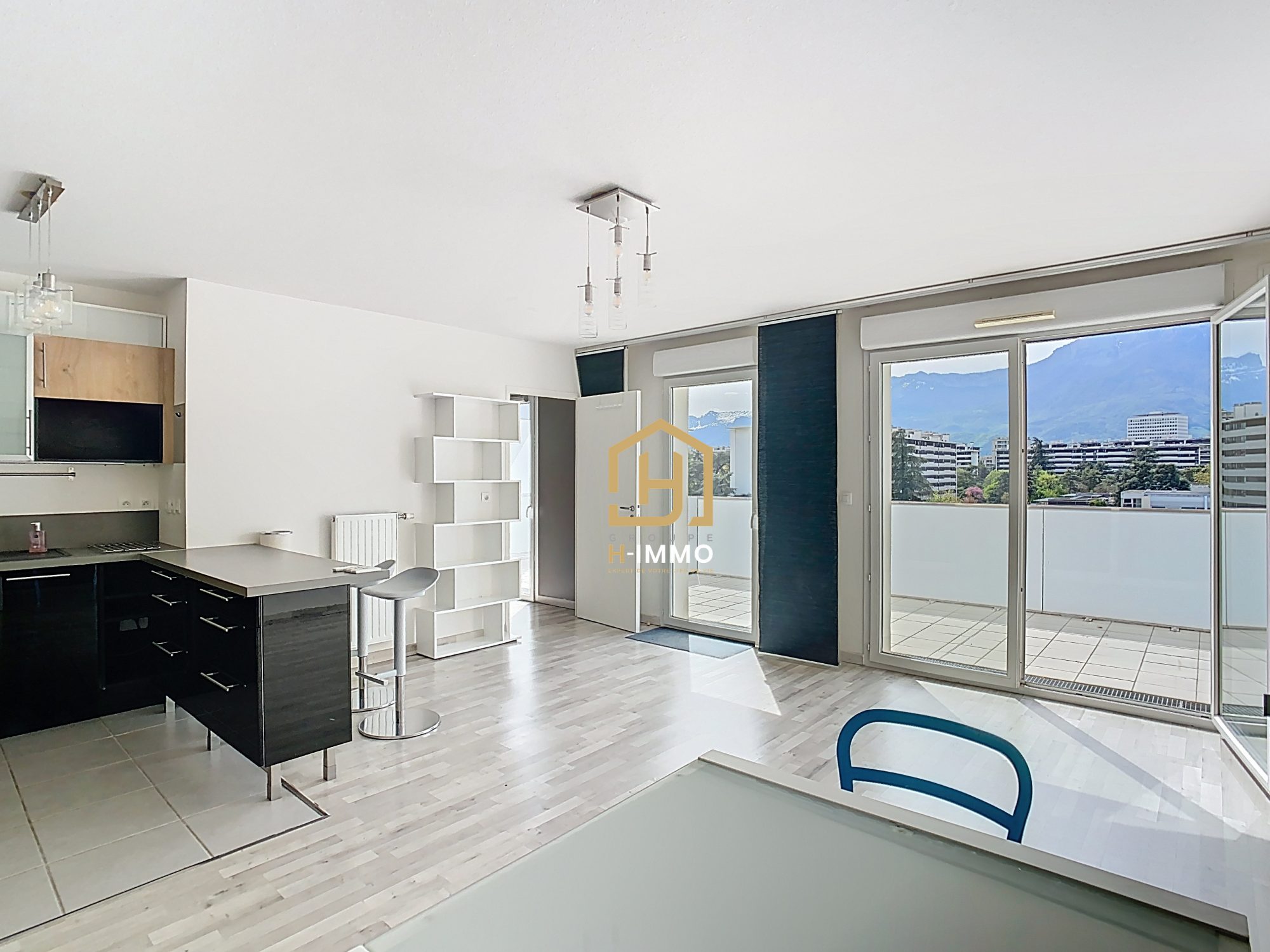 L’appartement s’ouvre sur une entrée fonctionnelle, équipée d’un placard de rangement, qui dessert directement une belle pièce de vie. Grâce à une très grande surface vitrée, l’espace est baigné de lumière naturelle et s’ouvre sur une terrasse permettant de profiter du panorama sur les montagnes. La cuisine est entièrement aménagée et équipée, offrant un cadre de vie moderne et convivial.